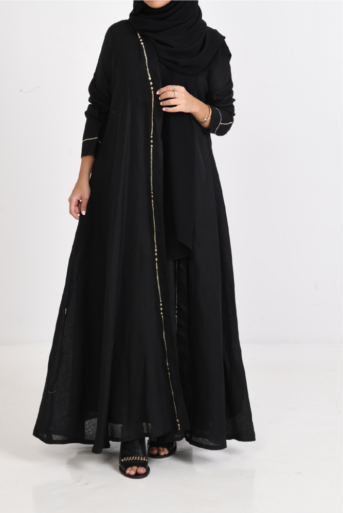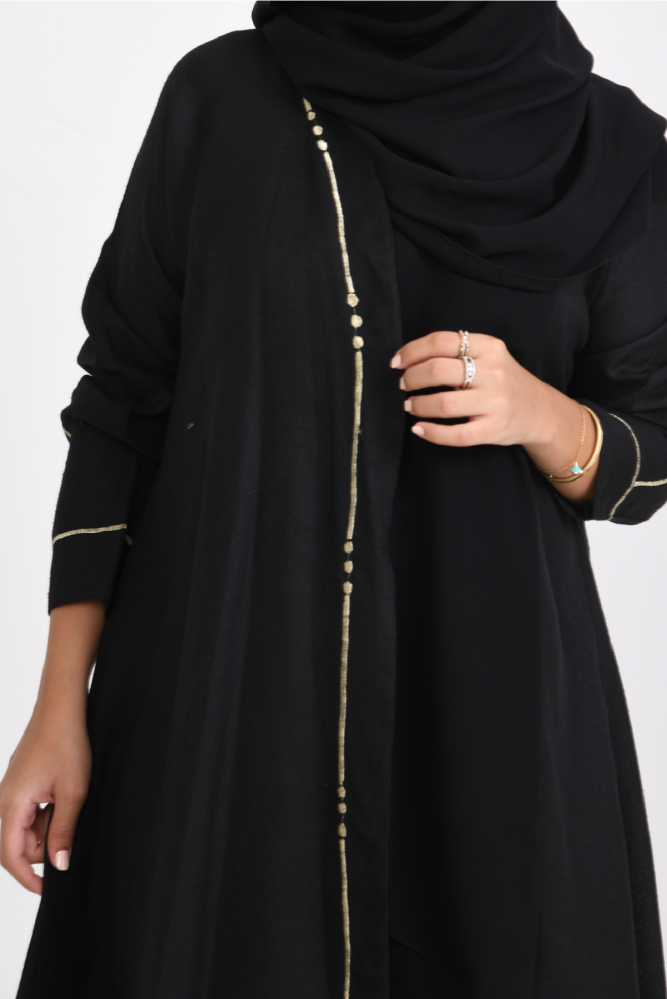 عباية لنن هندي يتميز بخيوطه المتداخلة التي تعطي مظهرا جميل في الارتداء و تتميز العباية بتصاميمها الراقية والفخمة في استخدام الخيوط الذهبية لتطريز الخطوط النجدية مما يجعلها قطعة أنيقة تليق بالمناسبات. جدا مناسب لأجواء المملكة والخليج لانه يسمح للهوا بالدخول. قصة الربع كلوش تتيح للمرأة حرية كبيرة في الحركة، مما يجعلها مثالية للمناسبات الرسمية واليومية. جمال الطرحة بالتطريز جعل العباية متناسقة و ملفته.