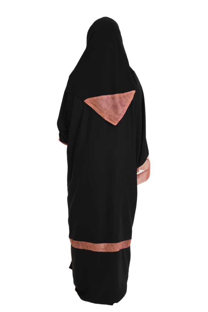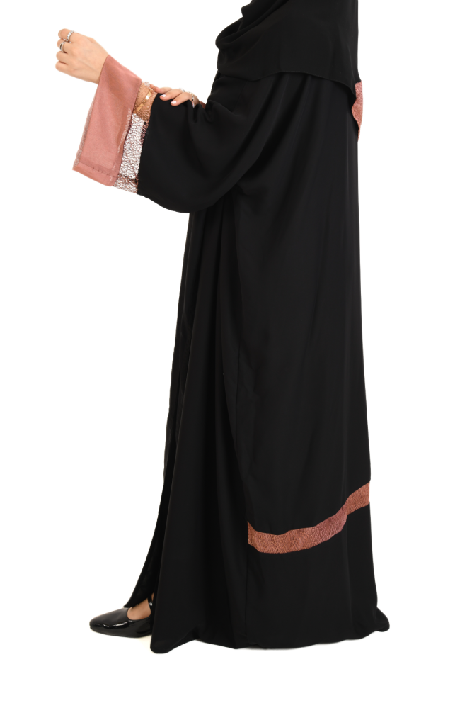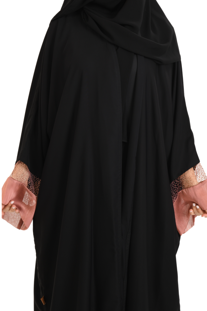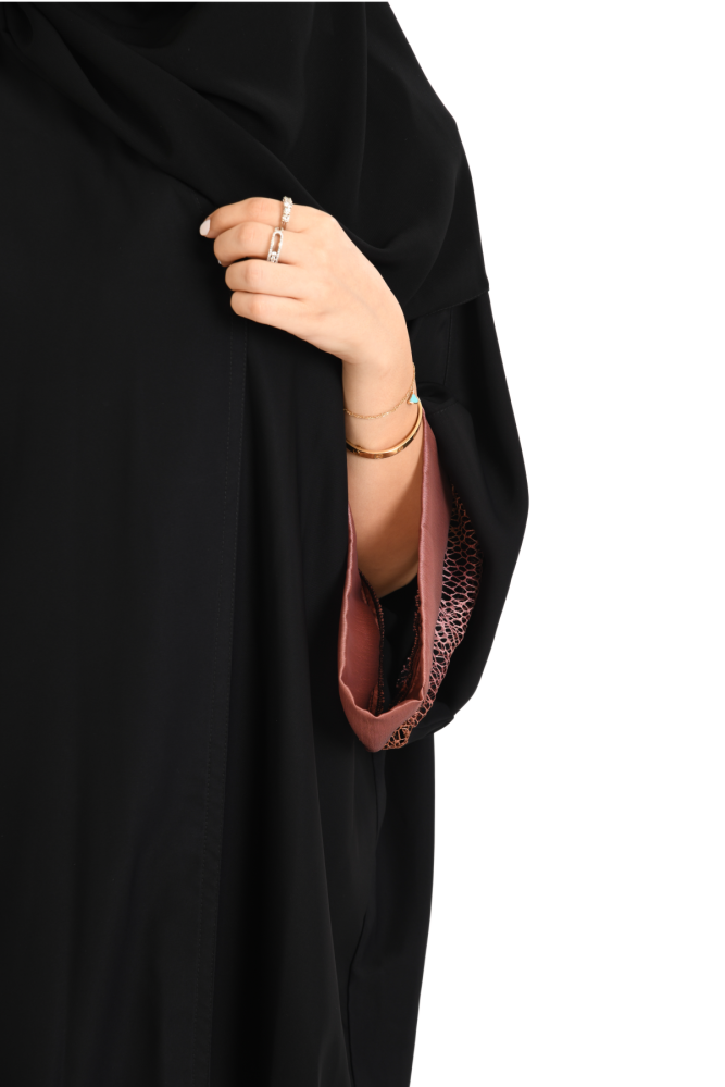 العباية من قماش الحرير الذي يتميز بنعومته و خفته، هو الخيار مثالي للمرأة الباحثة عن توازن بين الأناقة والراحة، العباية مناسبة لاجواء الصيف لانها تعطي إحساسا بالبرودة مصممة بقصة واسعة ومفتوحة تحاكي تصميم البشت السعودي، و بأكمام واسعة، انيقة في اللبس. جمال الطرحة بتفاصيلها تجعل العباية متناسقة.