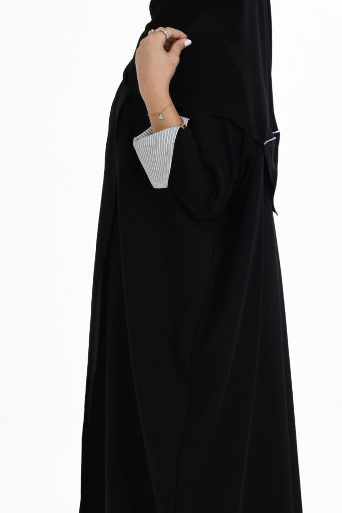 العباية من قماش الكريب الخفيف الذي يتميز بجماله وخفته، مما يظهر طايح ونصف واقف و هو الخيار مثالي للمرأة الباحثة عن توازن بين الأناقة والراحة، العباية مناسبة لاجواء الصيف لانها تعطي إحساسا بالبرودة مصممة بقصة واسعة ومفتوحة تحاكي تصميم البشت السعودي، و بأكمام ضيقة، انيقة في اللبس. جمال الطرحة بتفاصيلها تجعل العباية متناسقة.