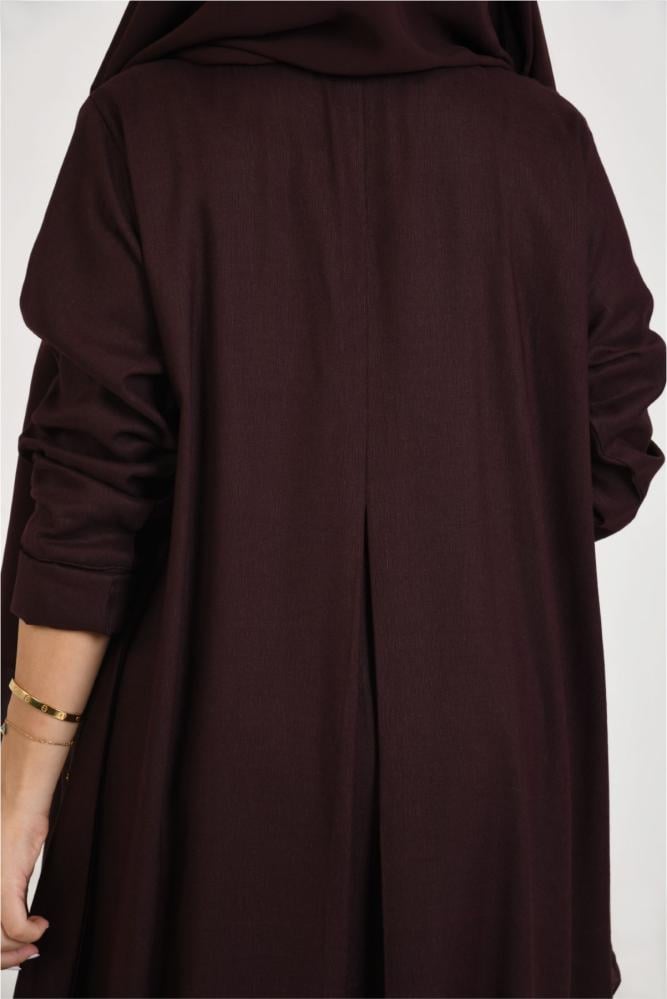 العباية من قماش اللينين الناعم، تتميز بخيوطها وخفتها. هذا النوع من اللينين يعتبر طايح، وهو الخيار المناسب للاستخدام اليومي لأنه يساعد على الراحة ويتناسب مع أجواء المملكة. القصة نص كلوش، والحركة الناعمة من الخلف تعطي العباية تصميمًا راقيًا ومميزًا. والأكمام الضيقة التي تتسفطت تصنع توازنًا يجعلها مناسبة للمناسبات والدوامات. واخيرا جمال الطرحة يجعل العباية متناسقة بالكامل.