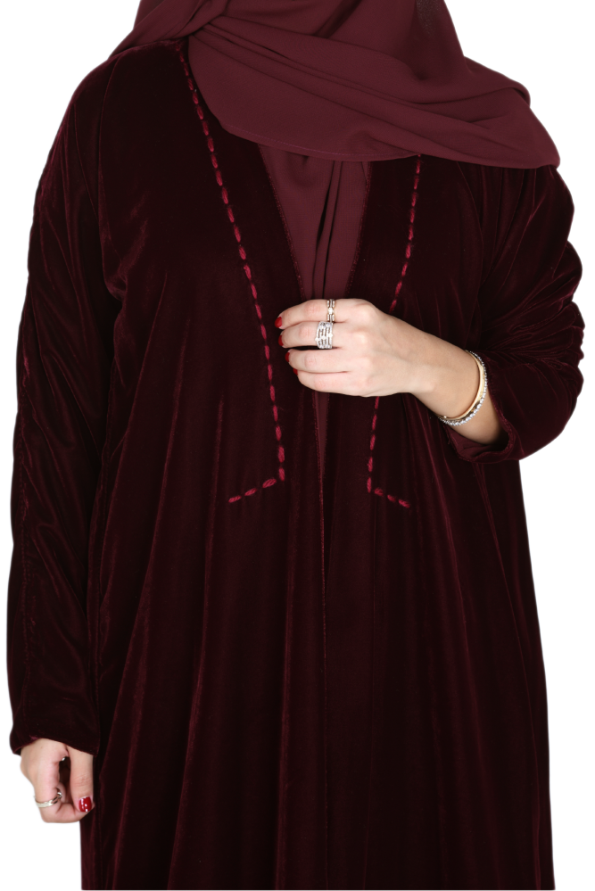 يعتبر القماش المخملي المستخدم في هذه العباية من أفخر أنواع الأقمشة للشتاء، حيث يتميز بملمسه الناعم و لونه المركز الذي يجعلها تبرز بأناقة خاصة. و هو خيار مثالي للمرأة الباحثة عن توازن بين الأناقة والراحة، مناسبة جداً للأجواء الشتوية في المملكة. الStraight cut تتيح للمرأة حرية كبيرة في الحركة، مما يجعلها مثالية للمناسبات الرسمية واليومية. الكم حقق توازن جميل في التصميم الكلي للعباية و جمال الطرحة بتفاصيلها تجعل العباية متناسقة و مرتبه.